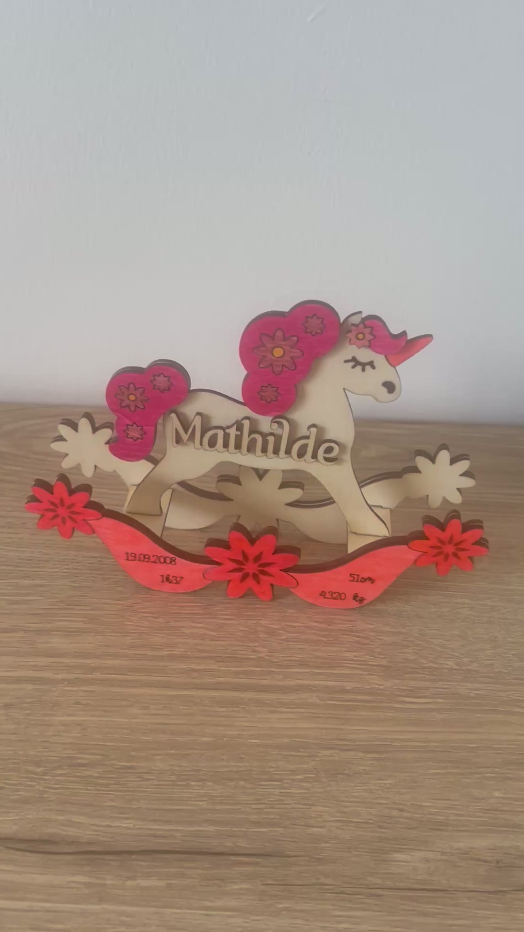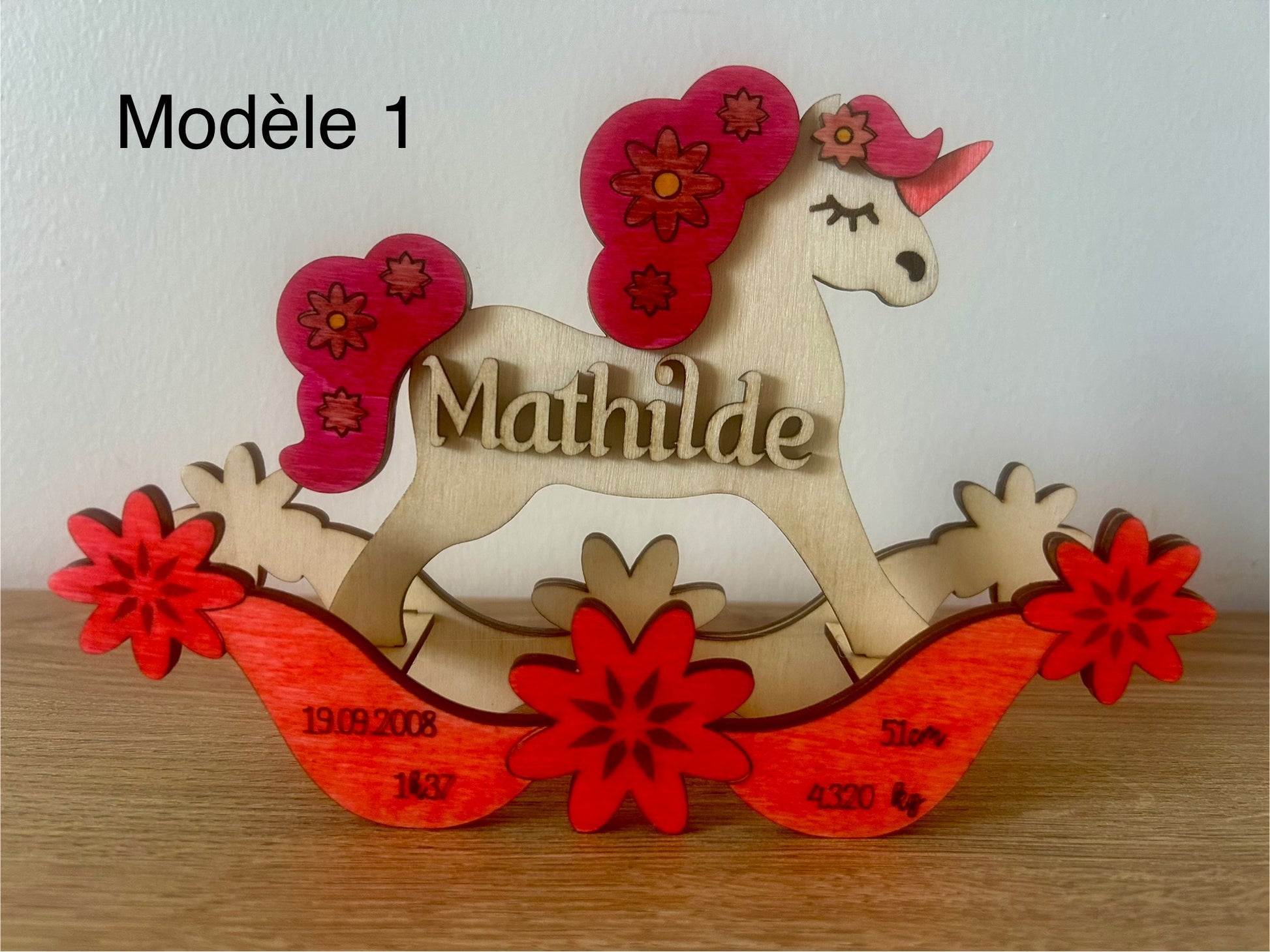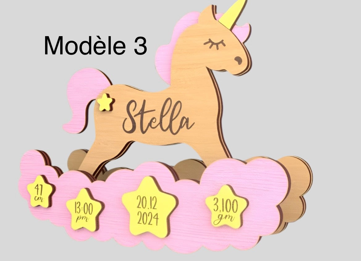 Ce magnifique cheval à bascule en bois est entièrement personnalisable avec les informations de naissance de l’enfant :